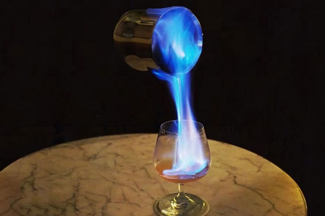 For the cocktail pros, the Blue Blazer is a show-stopping, flame-tossing experience! Scotch, sugar, and boiling water are lit on fire and “thrown” between mugs, caramelizing the sugar in a toasty display.