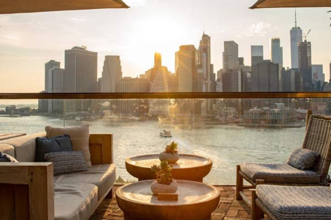 Harriet’s combines breathtaking city views with industrial-chic design. Located at 1 Hotel Brooklyn Bridge, this rooftop bar boasts fire pits, vertical gardens, and a stylish indoor lounge. The panoramic views stretch from the Statue of Liberty to Uptown Manhattan, making it an ideal spot for a sunset cocktail.